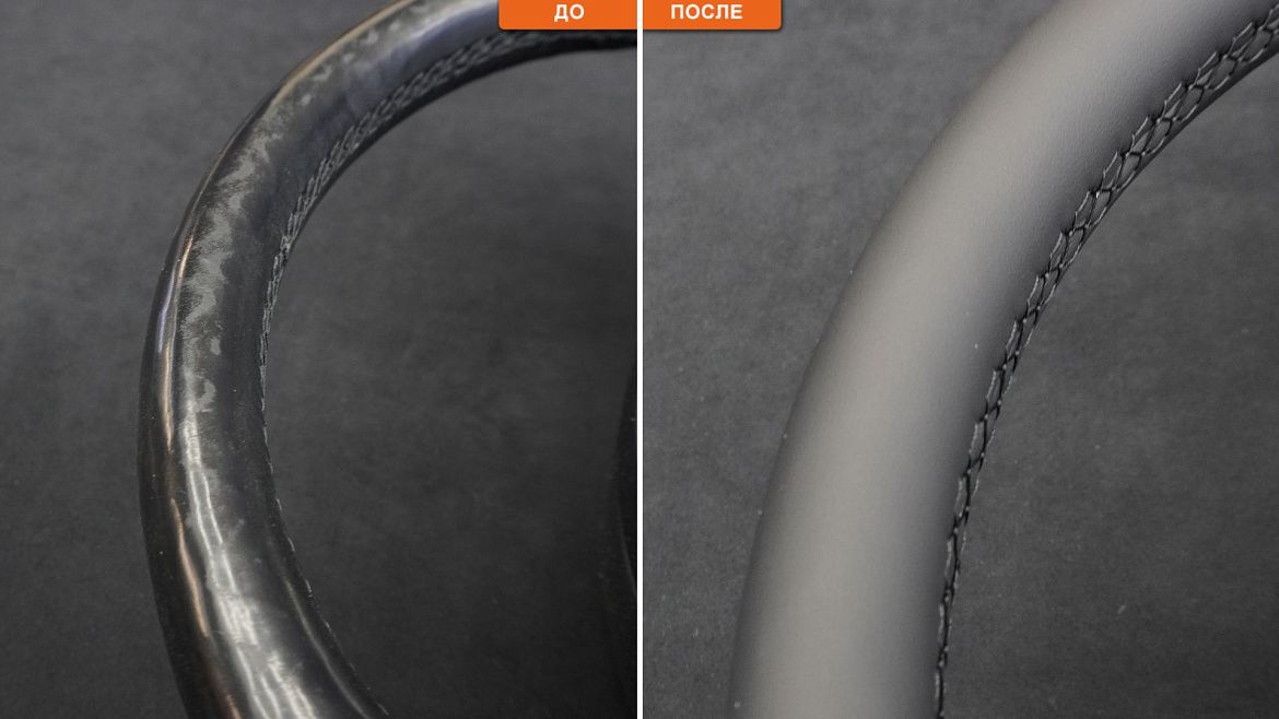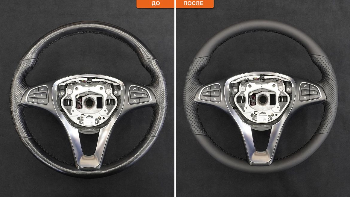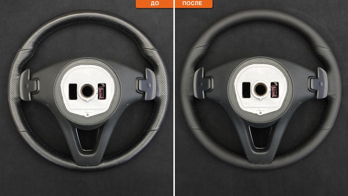 После перешива руль выглядит как новый, сохраняя заводскую форму, толщину и эргономику.
